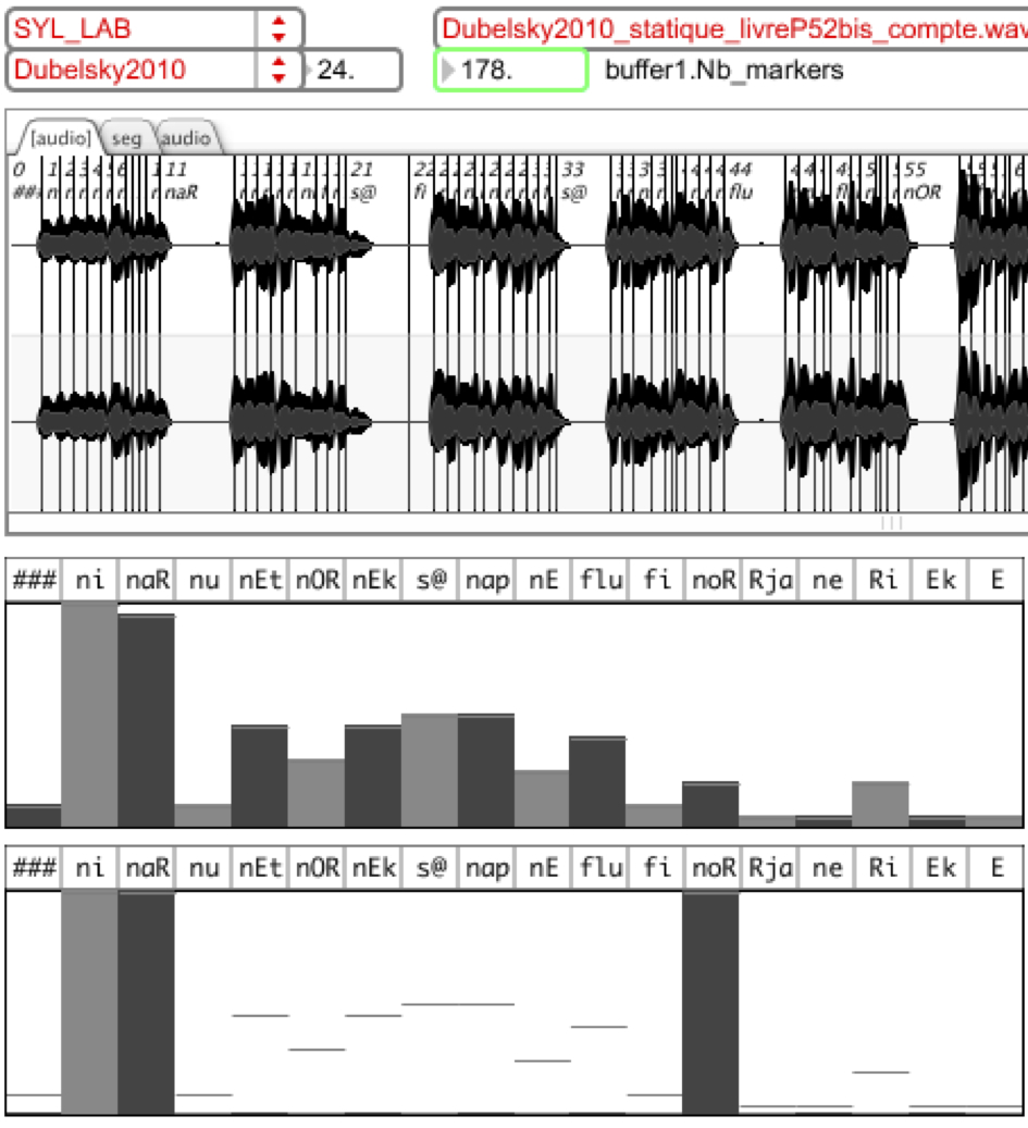 Speech synthesis in this context uses real-time generated texts and using IRCAM’s TTS Synthesis. In “Luna Park”, several technologies are combined to allow live text generations. The following figure shows a segmented recording in syllabus (on top), a histogram presenting frequency of appearance of each symbol (middle); and the same histogram guided for generation (low), for example by forcing equal appearance of syllables “ni”, “naR” and “noR”.